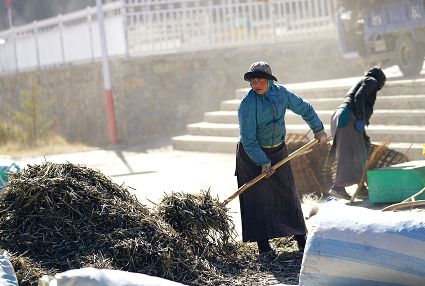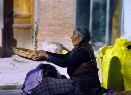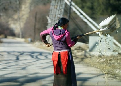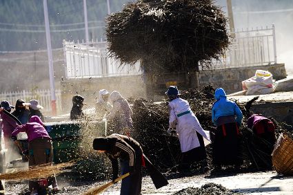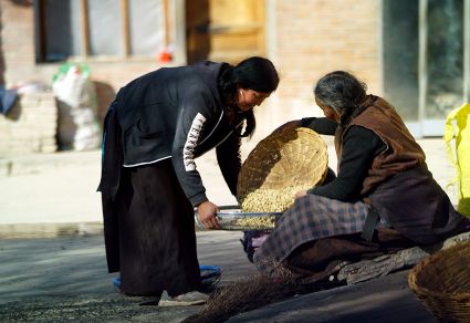 一群孩子會準(zhǔn)時來小二樓叫我,要去密林,要去山岡,要去尋找?guī)в薪?jīng)文的瑪尼石,還要去那個神秘的洞頂。比孩子們更準(zhǔn)時的是掛在小二樓上的四個大喇叭,鳥雀剛醒來,廣播就開始了,就必須要起來了。穿過巷道,和打豆子的人們一起享受勞動的幸福。我們在一起,等待著下午的廣播,因為廣播會給我們帶來無盡的喜悅。
