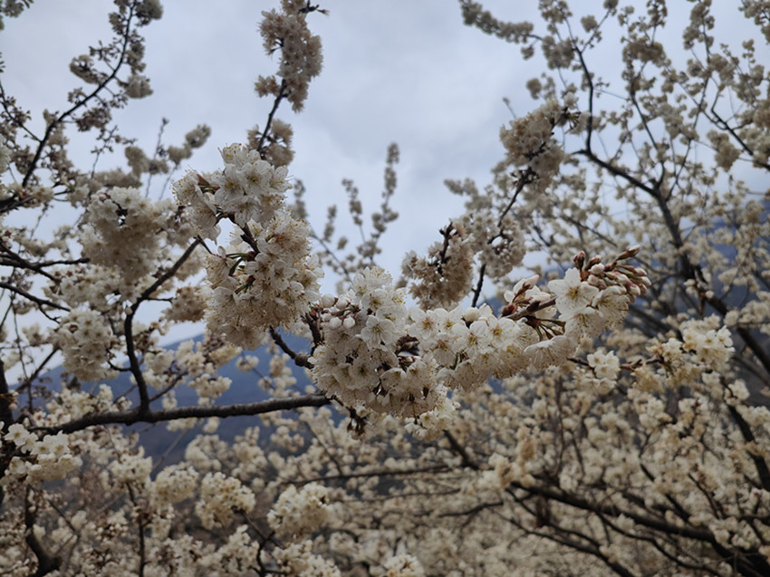 不同于油菜花的燦爛,瀘定縣冷磧鎮(zhèn)千畝櫻桃花,堆雪疊紗、滿山漫白,為整個(gè)山谷的金黃璀璨增添了一道恬謐的寧靜。