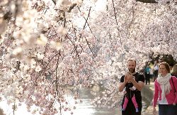 4月9日,游人在美國首都華盛頓的潮汐湖畔賞櫻。