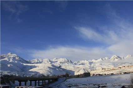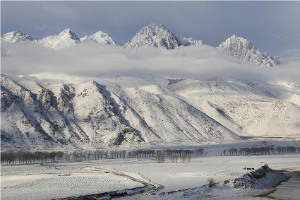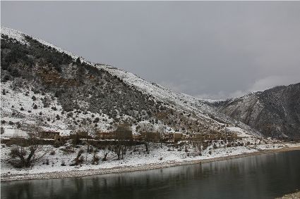 在接下來的路途中,停車休息的瞬間,一個臨水的村莊出現(xiàn)了。經(jīng)過昨夜的一場大雪,整個村子出人意料的“安靜”,河對岸牧民放馬的聲音,那個到河邊放下水桶汲水的女人取水的動靜,似乎都被一場雪過濾了。我即使走到河邊,也難以通過耳朵和眼睛接近這一切。一幅無聲的畫面更貼近一場雪。我放下手中的相機(jī),似乎也在放下一些多余的東西,尊重著一種留白。