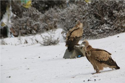 而隨后途經(jīng)中扎科鄉(xiāng),一群禿鷲正在飽食一頭死牛。牛身體內(nèi)流出的鮮血,早已和冰雪中板結(jié)的土層融合在一起。這些來自天空的使者用自己嘴和腸胃在一頭死去的牛和天空之間交接著某種儀式,它們的背景是雪,是具備凈化色彩的凝結(jié)物。這些禿鷲,它們自身也在從事著凈化的工作。