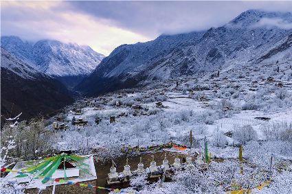 突然,耳畔傳來(lái)了誦經(jīng)聲。山坡下的平臺(tái)上,是一排白塔。白塔的周?chē)瑨鞚M了經(jīng)幡。早起的誦經(jīng)人,沿著中路藏寨的小路來(lái)到白塔,一邊轉(zhuǎn)白塔,一邊虔誠(chéng)誦經(jīng)。一年四季的地區(qū)稱(chēng)春雨貴如油,那么旱雨兩季的地區(qū)該怎么贊美春雪呢?怕是該稱(chēng)為春雪貴如金了。祈愿吧——一年好時(shí)節(jié),又是一個(gè)豐收年!