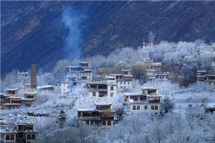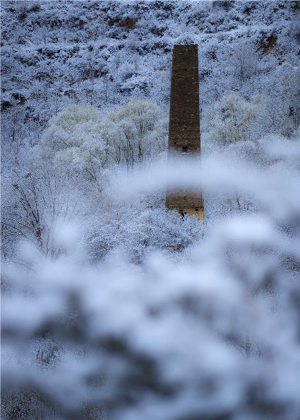 我以這份孤獨(dú)和執(zhí)著,爬上了東邊的山坡。雪停了,微風(fēng)習(xí)習(xí)。櫻桃花、桃花在雪枝頭冷艷,淡淡的幽香徐徐浸入心扉。滿眼望去,一片晶瑩,一片潔白。古碉藏寨在這片世界里,寧?kù)o安詳,不容一絲一毫的驚擾。我懷疑自己進(jìn)入了那種叫做空靈的境界。