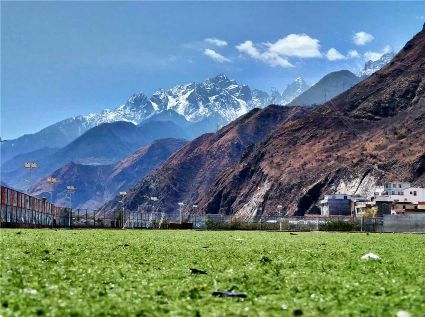 天空像剛被浸染的綢緞,蔚藍的主色已經(jīng)略顯;白雪好似從浸染的綢緞上滴落下的顏料與其它顏色的混合,眷戀的駐足在山尖,在其耳旁傾訴來年的約定;一顆顆萬年青穩(wěn)穩(wěn)的站立,將山中的寺廟、亭閣緊緊地包圍,見證著康定四季輪回的變化;依然披著秋冬贈予黃色外衣的樹木,拋開桎梏,堅守在一座座樓房旁。藍與白,黃與綠……這大美的晴天為人們帶來了別樣的視覺盛宴。