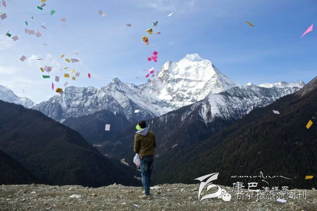 在車上,他很沉默,但當車停靠在亞丁村口的觀景臺前時,他下了車,從懷里掏出一大疊小紙片,揚手撒出,神色虔誠。