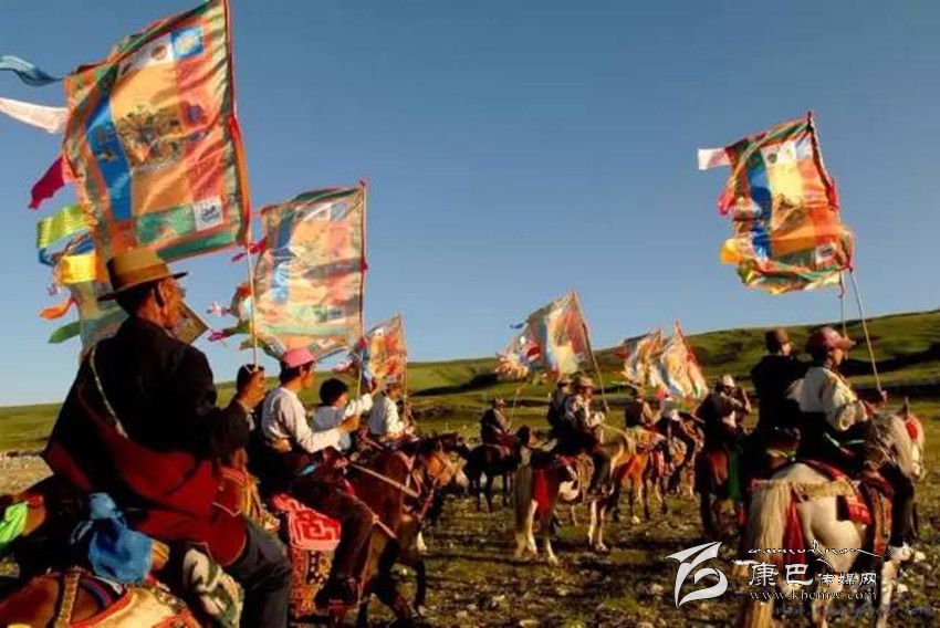 藏歷五月初四,就是色達(dá)牧民的祭神節(jié)。這天,牧民們?cè)诟魃忌嫌∩舷笳鞲獾慕?jīng)文,在經(jīng)旗周邊裝飾上白、紅、黃、綠、蘭布條。男子在自己的火槍槍架上,飾以經(jīng)幡,上邊掛一緞制煙祭用的小袋騎馬趕赴節(jié)日集會(huì)地點(diǎn)。