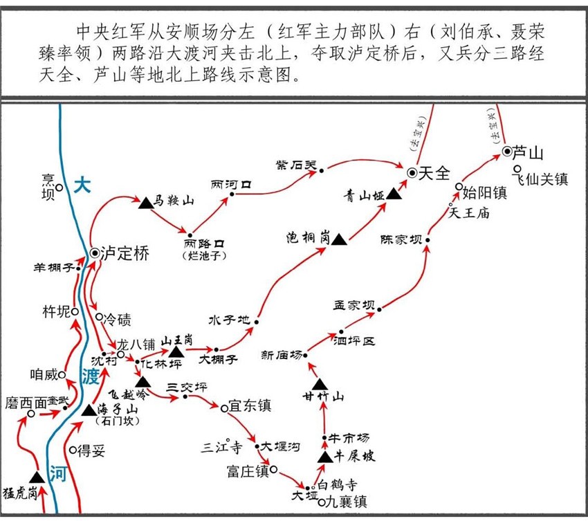 關(guān)于紅軍離開瀘定后的具體行軍路線,聶榮臻同志后來曾經(jīng)回憶:“我全軍過大渡河后,開始想回過頭來,南向清溪、富林,以扼阻中央軍渡河北上,所以我們1軍團(tuán)又在化林坪等地?fù)魸⑼耸氐诙€的四川軍閥河防部隊(duì)。以后軍委得知清溪有川軍守?cái)乘膫€(gè)旅,為了避免與敵糾纏,盡快與四方面軍靠攏。又命令我們繼續(xù)北上去占領(lǐng)天全、蘆山。”5月31日,飛奪瀘定橋的紅2師4團(tuán)不顧連日行軍作戰(zhàn)的疲勞,從瀘定趕到飛越嶺下,攻打飛越嶺。飛越嶺位于瀘定縣東南,是漢源和瀘定的分界地,海拔近3000米。山頂有一隘口,稱為飛越關(guān)。此關(guān)是瀘定能往漢源、滎經(jīng)的道路,也是紅軍北上的必經(jīng)之地。6月1日清晨,紅軍發(fā)起對(duì)飛越關(guān)敵軍陣地的偷襲戰(zhàn),在付出30余人傷亡的代價(jià)后,成功占領(lǐng)了飛越關(guān)。