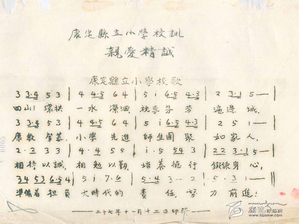 在眾多的民國(guó)教育檔案中,關(guān)于西康省各地學(xué)校的學(xué)生花名冊(cè)、學(xué)生成績(jī)表、學(xué)校經(jīng)費(fèi)運(yùn)用情況,以及教職工領(lǐng)取工薪的領(lǐng)條和表格等等有相當(dāng)大的一部分。難得的是,在這些檔案中竟然出現(xiàn)了兩份“歌譜”。細(xì)看卻不只是“歌譜”,而是兩所小學(xué)把自己學(xué)校的“校訓(xùn)”寫成的“校歌”。其中,一份是康定縣立小學(xué)依據(jù)校訓(xùn)“親愛精誠(chéng)”寫成的校歌,另一份是日地短期小學(xué)依據(jù)校訓(xùn)“智仁勇”寫成的校歌。通過(guò)這兩份“校歌”,可以看到當(dāng)時(shí)小學(xué)教育已經(jīng)較為正軌,還開設(shè)有音樂(lè)課。“校歌”的內(nèi)容積極向上,充盈現(xiàn)在所說(shuō)的“正能量”,鼓勵(lì)學(xué)生努力學(xué)習(xí),成為有擔(dān)當(dāng)?shù)娜恕?/div>