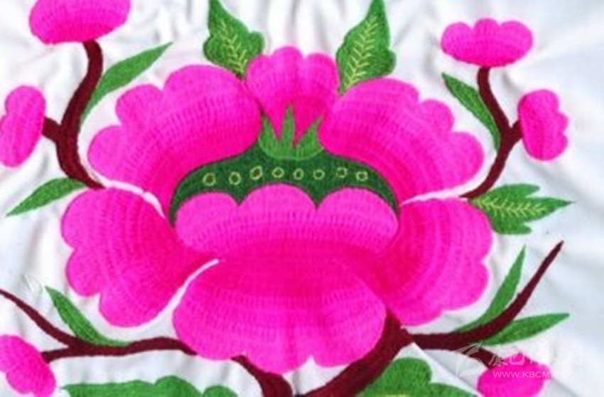 在魚通,刺繡以花朵為主。會繡花的女人,被稱為“花匠”?!靶』ń场眰儚氖鄽q就開始接觸刺繡,通過年長者口傳身授,自學的方式成為一代繡女。稚嫩的雙手,再經(jīng)過時間的洗禮,刺繡的技巧早已爛熟于心,在心的指引下,穿針引線,針尖如麥芒,各色陪底線來回,穿梭于布料的經(jīng)緯之間。買回青布,從下手的第一針開始,整幅圖的構架便了然于心,各式花朵圖案成竹在胸,線條在暗自游走,勾勒越來越清晰。每一次的飛針走線,是婦人手上的一針針,一線線,都在為作品最后的完美收關,錦上添花,做著必不可少的鋪墊。