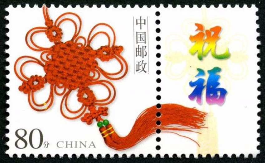 2002年5月10日,中國郵政發(fā)行《如意》個性化服務(wù)專用郵票一枚。主票圖案為如意柄端系著一個紅色“中國結(jié)”,附票有“祝福”二字; 2003年3月3日,中國郵政發(fā)行《同心結(jié)》個性化服務(wù)專用郵票一枚。主票圖案為盤長結(jié)4邊編織有心型繩結(jié)的同心結(jié),附票為“祝福”二字;2006年9月25日,中國郵政發(fā)行《中華全國歸國華僑聯(lián)合會成立五十周年》紀念郵票一枚。圖案為阿拉伯?dāng)?shù)字“5”與中華全國歸國華僑聯(lián)合會圓形會徽組成數(shù)字“50”,象征全國僑聯(lián)五十周年,背景畫面為淡淡的粉紅色“中國結(jié)”。寓意歸國華僑與全國人民血肉相連,同心同德共同建設(shè)美好家園;2013年8月8日,中國郵政發(fā)行一枚《美好祝福》賀卡專用郵票,圖案為象征喜慶的紅色“中國結(jié)”;2014年9月20日,中國郵政發(fā)行《中國夢(二)——民族振興》特種郵票,其中第四枚“民族團結(jié)”,圖案中載歌載舞的各民族群眾上方有一個大紅的“中國結(jié)”,象征著各民族大團結(jié)。