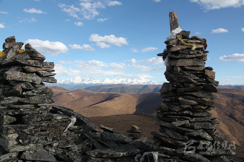 在高爾寺山頂,一個標(biāo)注有海拔4412米的藍底標(biāo)志牌顯得有些孤單,與之相伴的,除了呼嘯的大風(fēng)外,還有隨風(fēng)飄動的嘛呢旗。頭頂?shù)乃{天沒有一朵云彩,遠處的雪山格外潔白耀眼,曾經(jīng)繁茂的小草已經(jīng)枯黃了,幾朵不知名的野花在寒風(fēng)中書寫著最后的輝煌,仿佛在向人們宣誓著它的存在。