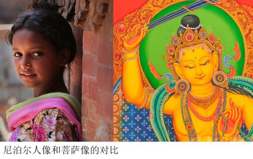 特別值得注意的是:之前佛教藝術的帕拉風格繪畫中的臉型普遍是方正偏長的,而在尼瓦爾唐卡里,臉型普遍是方正偏短。偏短的方臉會讓五官顯得更加集中一點,特別是眉額比較大、眼睛位置下移,這樣的感覺有點近似于嬰兒的面部比例。而眉骨、鼻骨高挺,又不似兒童,這樣的面部特征其實和尼國人的長相比較接近。也許是尼瓦爾人善于觀察、擅長描摹的天分,逐漸把本民族沉靜的性格與容貌,潛移默化地滲透進了唐卡,產生了新的風貌。