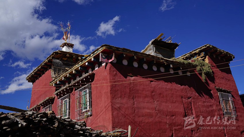 外裝飾也不繁復。外墻用磚紅色粘土調(diào)成泥漿上色,現(xiàn)在多用化學顏料。大門用一種叫“抓”的天然礦物質(zhì)涂料,這種顏料容易染色,挨一挨都會讓衣服沾上絳紅色,現(xiàn)在也用化學涂料代替。二樓與“砸口樓”檐口處裸露在外面的木頭,用漆絳紅色顏料涂抹,支出來的小圓木涂白色顏料。遠遠望去,紅白相間,錯落有致,巴塘方言藏語稱之為“東椎”。檐口頂上用排成“人”字形的小青瓦點綴,窗框和門框都涂成絳紅色,也用“東椎”與青瓦裝飾;有條件的人家安裝雕花窗棱,嫌麻煩就用普通的大格子窗。外置庭院,種花植木,一座傳統(tǒng)的紅藏房便竣工了。