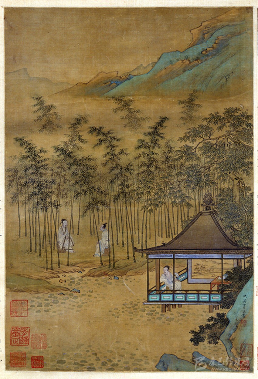 此圖意境極像唐代詩人王維的藍田山別墅。這里林木茂密,山澗淙淙,館舍、房屋散布其間,每到夏季,山風習習,涼爽怡人,王維和文友們在此度夏避暑,垂釣飲酒,談論詩文,修身養(yǎng)性,過著悠閑自在的隱居生活。他在《竹里館》一詩里寫過自己的隱居快樂感受:“獨坐幽篁里,彈琴復長嘯。深林人不知,明月來相照?!比姼裾{(diào)幽靜閑遠,仿佛詩人的心境與自然的景致全部融為一體了。宋朝詩人楊萬里喜歡在皎潔的月光之下,清輝孤影,來到搖曳的竹林中,聽著夏夜里悅耳的蟲鳴,夜深氣清,盡管沒有涼風送爽,但是悶熱暑氣頓時消失,于是他寫了一首《夏夜追涼》詩:“夜熱依然午熱同,開門小立月明中。竹深樹密蟲鳴處,時有微涼不是風。”