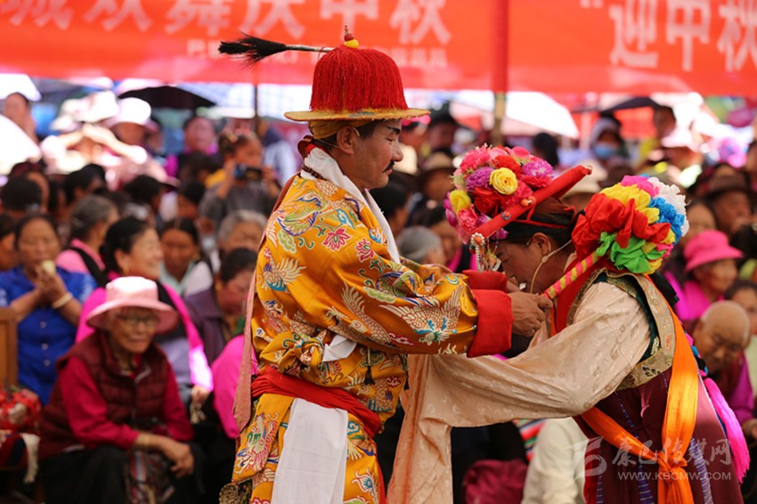 九月,龍王塘,藏戲《嘎拉旺布》演出現(xiàn)場(chǎng)。西繞反串花仙卓瓦桑姆,他頭戴花冠,頂上的三叉“巴珠”(后藏女人的一種頭飾)上插滿(mǎn)了粉色和紅色的絹花。身上穿著各色綢緞拼制成的無(wú)袖藏袍“拉姆切”,上套無(wú)袖彩條花氆氌帶和藍(lán)綠花緞帶連綴成的褂子。踩著鼓與鈸敲擊出的節(jié)奏,他的兩只腳進(jìn)、頓、點(diǎn)、退,舞步輕盈,手腕跟隨節(jié)奏,以頭部和肩部為限,左舞右蹈,用肢體語(yǔ)言表現(xiàn)人物的思想感情,這是該劇第一幕《定情月下》:湖畔仙景,卓瓦桑姆偕眾仙女婆娑起舞。國(guó)王隨仙鹿而來(lái),向卓瓦桑姆傾訴衷情,花仙為國(guó)王的真情所動(dòng),愿永結(jié)同心。仙翁降臨贈(zèng)箭祝福,二人辭別眾仙……。炎炎烈日下,西繞薄施脂粉的面頰已被幾行汗水弄花,但他不以為意,此時(shí)此刻,他不是西繞,而是花仙卓瓦桑姆。從進(jìn)場(chǎng)伊始,他便與角色融為一體。周遭的觀眾認(rèn)真觀看、解讀,現(xiàn)場(chǎng)一片和諧,最美的時(shí)光在這一刻被盡情雕刻。