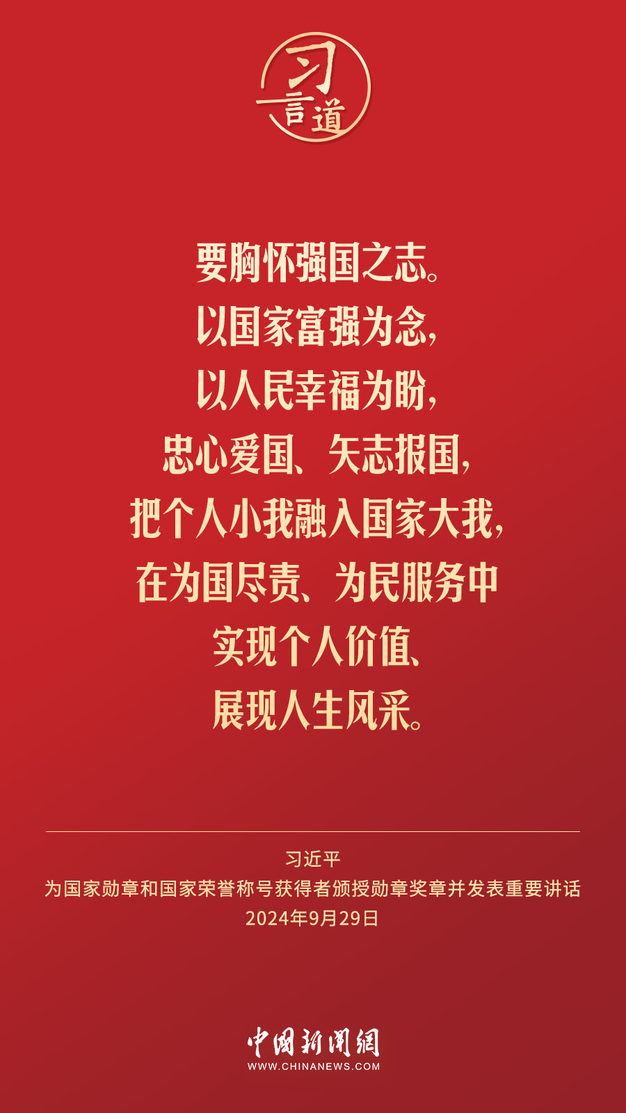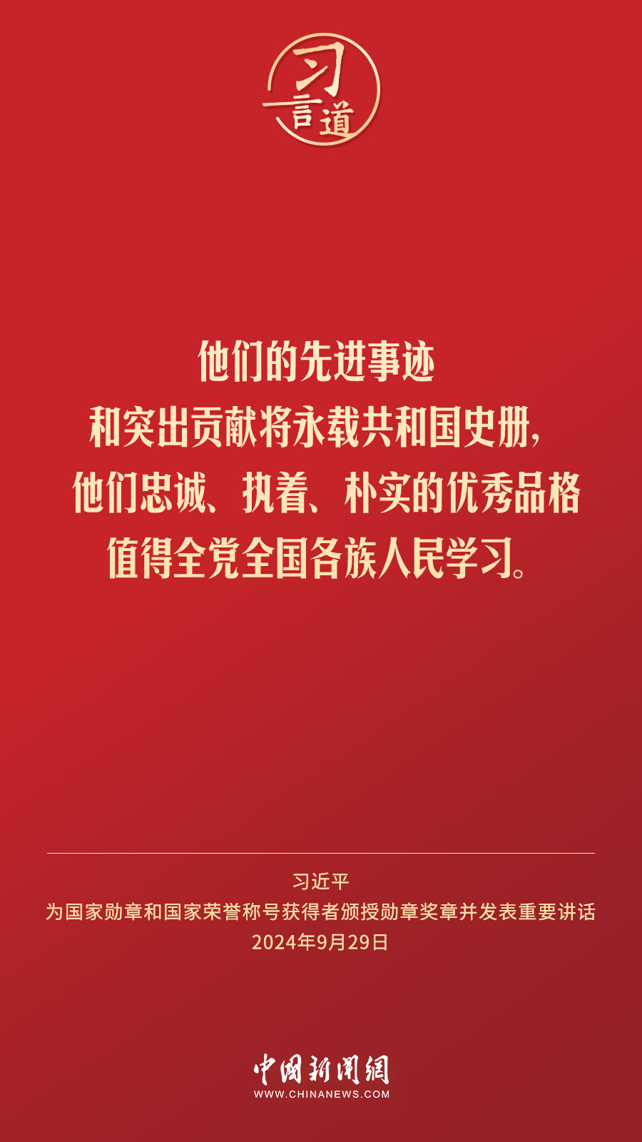 經(jīng)中共中央批準(zhǔn),中華人民共和國(guó)國(guó)家勛章和國(guó)家榮譽(yù)稱(chēng)號(hào)頒授儀式于9月29日上午10時(shí)在人民大會(huì)堂隆重舉行。中共中央總書(shū)記、國(guó)家主席、中央軍委主席習(xí)近平向國(guó)家勛章和國(guó)家榮譽(yù)稱(chēng)號(hào)獲得者分別授予“共和國(guó)勛章”“友誼勛章”和國(guó)家榮譽(yù)稱(chēng)號(hào)獎(jiǎng)?wù)虏l(fā)表重要講話。習(xí)近平指出——