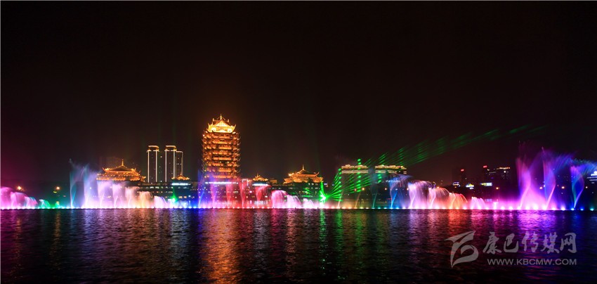 圖為眉山東坡市濕地公園音樂水舞噴泉。