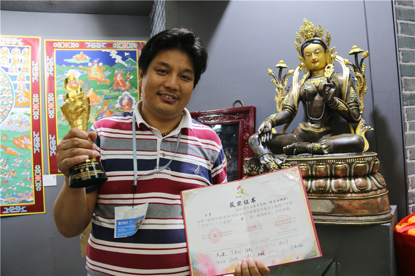 本網(wǎng)訊(記者 宋志勇 文/圖)5月14日,歷時5天的2018年第十四屆中國(深圳)國際文化產(chǎn)業(yè)博覽交易會(以下簡稱深圳文博會)圓滿落幕。我州憑借花色青銅《綠度母佛像》作品摘得“中國工藝美術(shù)文化創(chuàng)意獎”金獎,成為本屆文博會大眾關注的焦點。