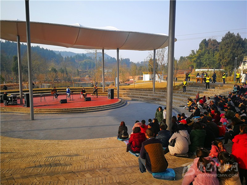 “遠(yuǎn)處的東山俯望著平靜的旌湖水,它流淌著,帶走了年輕的歲月……這就是我的家德陽,遠(yuǎn)方的人回來吧!”1月19日上午,在旌陽區(qū)東湖街道高槐村里傳來動聽的民謠。遠(yuǎn)遠(yuǎn)看去,村民們圍坐在“田野秀場”正聽著樂隊(duì)歌唱,不時(shí)還跟著音樂打著拍子。