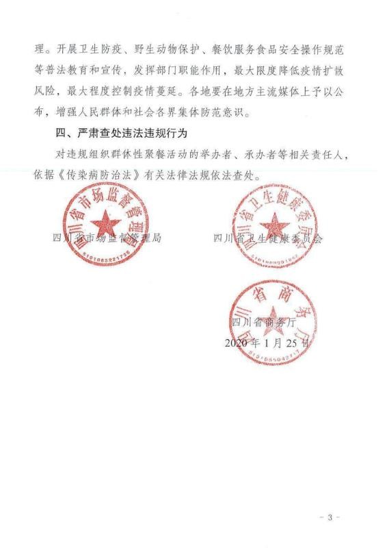 四川新聞網(wǎng)成都1月25日訊(記者 李丹)1月25日,四川省市場(chǎng)監(jiān)督管理局、四川省衛(wèi)生健康委員會(huì)、四川省商務(wù)廳3部門(mén)聯(lián)合發(fā)布緊急通知,近期新型冠狀病毒感染的肺炎疫情防控形勢(shì)嚴(yán)峻,為認(rèn)真貫徹落實(shí)省委省政府關(guān)于啟動(dòng)重大突發(fā)公共衛(wèi)生事件一級(jí)響應(yīng)措施暨應(yīng)對(duì)新型冠狀病毒感染的肺炎疫情決策部署,有效保證廣大群眾生命安全,根據(jù)《傳染病防治法》等有關(guān)法律法規(guī),禁止任何餐飲單位和個(gè)人舉辦任何形式的群體性聚餐活動(dòng),已經(jīng)訂餐的應(yīng)盡快取消或延期舉辦。