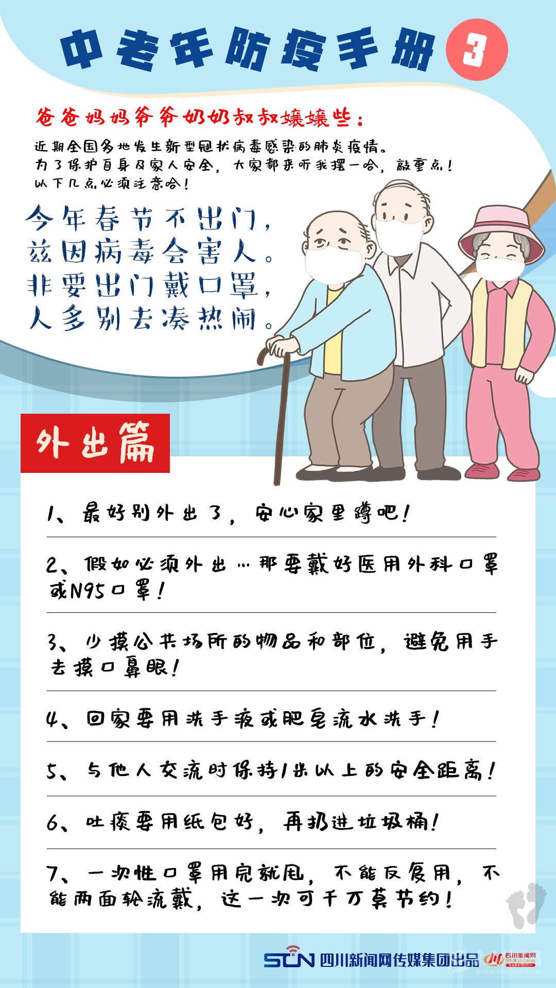 對(duì)此,為了讓“這屆難帶的父母”進(jìn)一步認(rèn)識(shí)新型冠狀病毒感染的肺炎疫情,四川新聞網(wǎng)特別推出《中老年防疫手冊(cè)》,呼吁老年人重視疫情,科學(xué)防控,做好自己健康的第一責(zé)任人。還在等什么,快轉(zhuǎn)給你那“倔強(qiáng)”的父母吧!