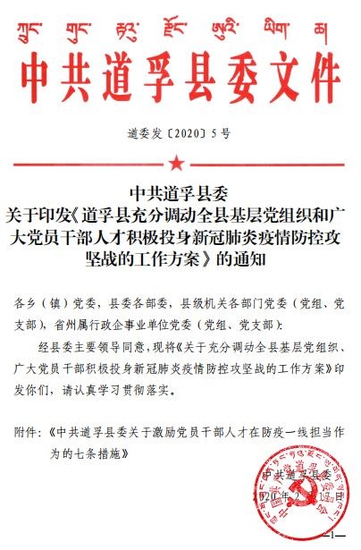 疾風(fēng)知?jiǎng)挪荩迨幾R(shí)誠(chéng)臣。自新型冠狀病毒肺炎疫情防控阻擊戰(zhàn)打響以來(lái),道孚縣各級(jí)黨組織和黨員、干部主動(dòng)擔(dān)當(dāng)作為,積極投入疫情防控最前線,為有力防控疫情蔓延作出重要貢獻(xiàn)。近日,道孚縣委印發(fā)《中共道孚縣委關(guān)于激勵(lì)黨員干部人才在防疫一線擔(dān)當(dāng)作為的七條措施》,關(guān)心關(guān)愛(ài)、激勵(lì)引導(dǎo)廣大黨員、干部、各類人才在疫情防控一線履職盡責(zé)、擔(dān)當(dāng)作為、安心戰(zhàn)斗。