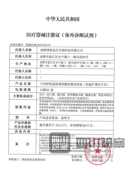 2月22日,國家藥品監(jiān)督管理局應(yīng)急審批通過3個新型冠狀病毒檢測產(chǎn)品,其中之一的“六項(xiàng)呼吸道病毒核酸檢測試劑盒”就是鐘院士提到的試劑,而它則是由位于成都溫江的企業(yè)——博奧生物聯(lián)合清華大學(xué)、四川大學(xué)華西醫(yī)院共同設(shè)計(jì)開發(fā)的。這款產(chǎn)品正在迅速應(yīng)用到疫情防控前線,為一線提供快速、精準(zhǔn)、有效診斷。