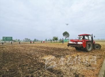 綿陽市安州區(qū)河清鎮(zhèn)小麥綠色高質(zhì)高效示范區(qū)內(nèi),正在展示小麥機(jī)械直播施肥一體化技術(shù)。