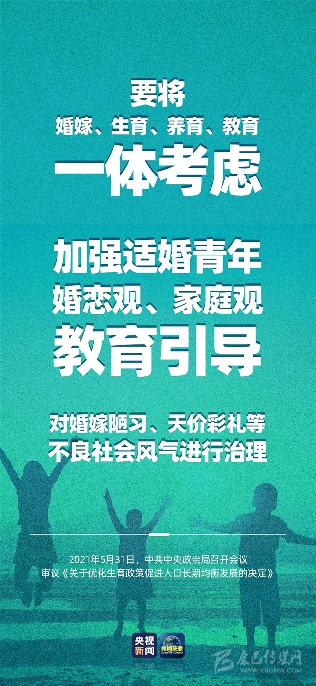 積極應(yīng)對(duì)人口老齡化,我國將出臺(tái)重大政策舉措。中共中央政治局5月31日召開會(huì)議,會(huì)議指出,進(jìn)一步優(yōu)化生育政策,實(shí)施一對(duì)夫妻可以生育三個(gè)子女政策及配套支持措施,有利于改善我國人口結(jié)構(gòu)、落實(shí)積極應(yīng)對(duì)人口老齡化國家戰(zhàn)略、保持我國人力資源稟賦優(yōu)勢(shì)。