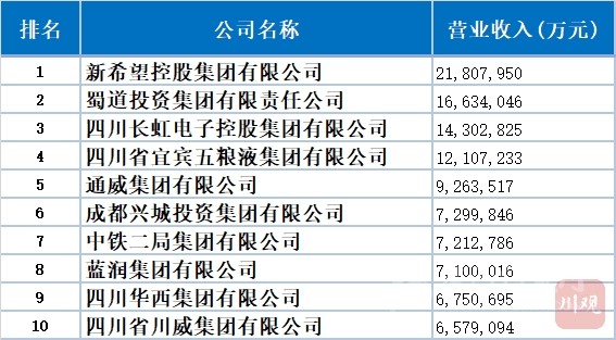 2021年四川有14家四川企業(yè)入圍中國企業(yè)500強,較上年減少1家。新希望控股集團有限公司以21,807,950萬元的營收成為進入中國500強的四川企業(yè)首位,總排名109位,比去年上升25位。其余入圍企業(yè)名單如下。
