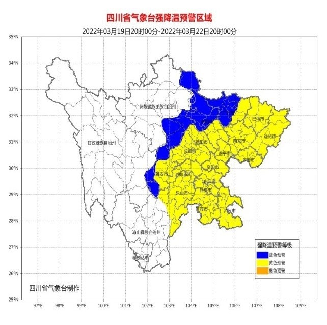 3月18日下午以來,四川省成都、南充、廣元、眉山、內江、綿陽、雅安、遂寧、樂山、瀘州、資陽、眉山、宜賓13市都發(fā)布了強降溫黃色預警,德陽、巴中2市發(fā)布了強降溫藍色預警,廣安、內江2市于3月19日升級發(fā)布了強降溫黃色預警。