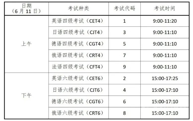 CET考試時(shí)間為6月11日,開考科目為英語、日語、德語和俄語4個(gè)語種的四級(jí)和六級(jí),法語四級(jí)。具體場(chǎng)次安排如下:
