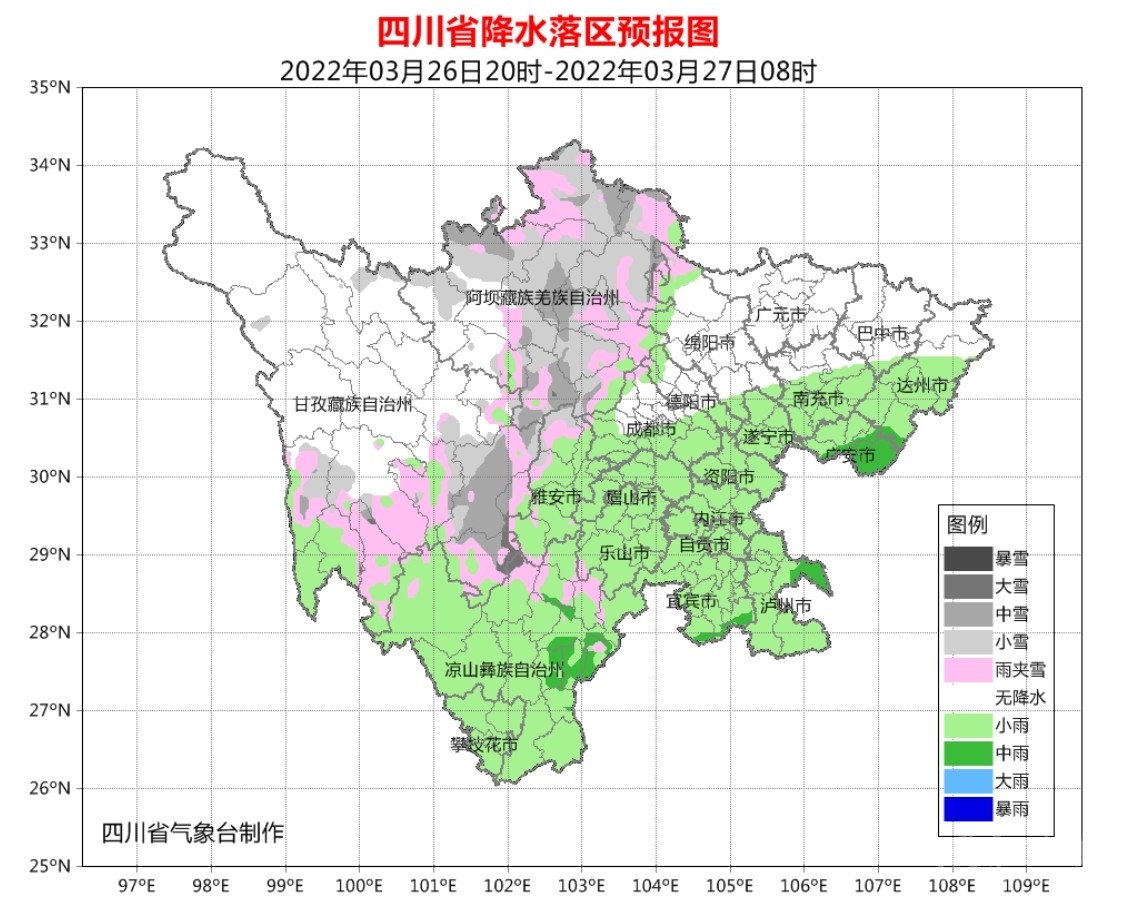 今天晚上:廣元、巴中、綿陽(yáng)、德陽(yáng)4市和成都、達(dá)州、南充3市北部陰天,盆地其余地方小雨,廣安、瀘州2市局部有中雨;阿壩州大部和甘孜州南部有陣雪(雨),甘孜州北部陰天;攀西地區(qū)陰天有小雨,局部地方有中雨。