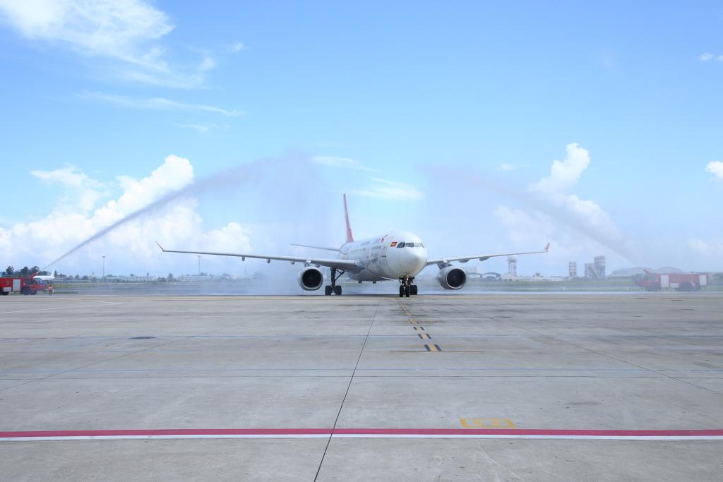 ??2023年1月18日,中國首都航空JD455航班在馬爾代夫馬累維拉納國際機場接受水門禮。