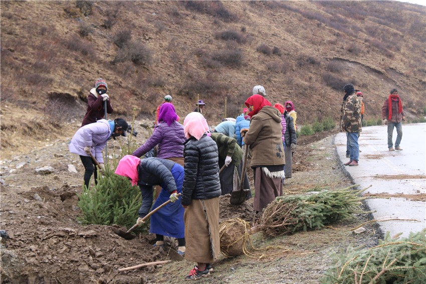 圖為甘孜縣群眾正在國(guó)道317線旁植景觀樹。
