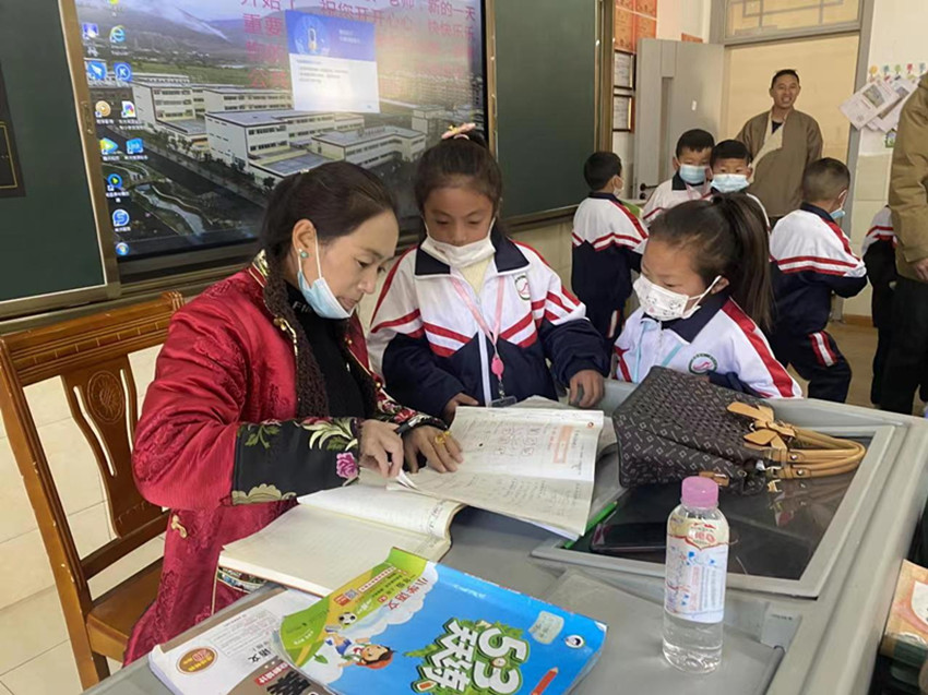 老師正在查收學(xué)生寒假作業(yè)。