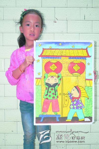 “我和弟弟迎親人”是瀘定縣成武小學(xué)二年級(jí)學(xué)生,周靖蕓同學(xué)有感于阿婆家中常有結(jié)對(duì)認(rèn)親干部來(lái)走訪關(guān)心而作的畫(huà)。據(jù)小朋友自己說(shuō):她畫(huà)的房子是她阿婆家,掛燈籠的女孩是自己,拿‘迎親人’條幅的是弟弟,畫(huà)星星是認(rèn)親干部有時(shí)晚上也會(huì)到她阿婆家。(王可富 攝影報(bào)道)