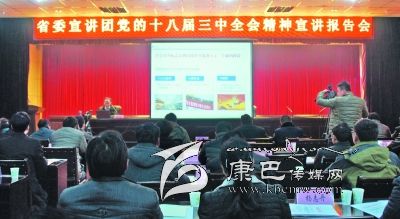 12月25日,省委宣講團(tuán)在海螺溝景區(qū)宣講黨的十八屆三中全會精神,由省委講師團(tuán)教授韓旭作宣講,海螺溝景區(qū)景區(qū)管理局、磨西鎮(zhèn)、新興鄉(xiāng)副科實(shí)職以上干部,21個行政村村兩委班子成員,部份州、縣人大政協(xié)代表,離退休同志代表和三老干部代表,省州屬各派駐機(jī)構(gòu)負(fù)責(zé)人以及部分旅游企業(yè)負(fù)責(zé)人聆聽了報(bào)告。圖為報(bào)告會現(xiàn)場。(李娟 攝影報(bào)道)