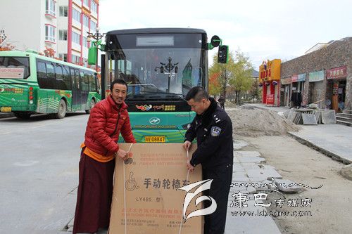 汪都老人的朋友幫助領(lǐng)輪椅。