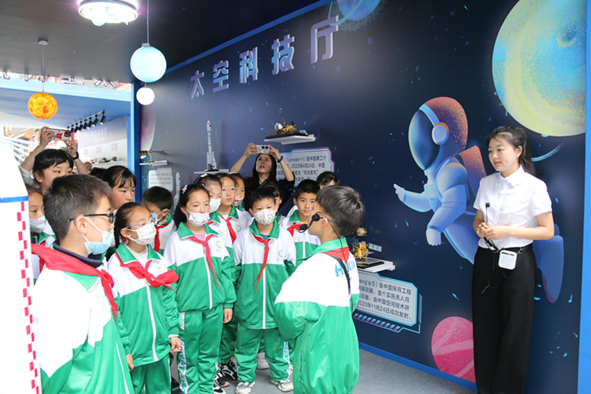 “航天夢是中國夢、華夏夢,神舟十六號載人飛船發(fā)射成功并進(jìn)入預(yù)定軌道。古人仰望星空,幻想上天攬?jiān)碌膲粝?,在一代代中國航天人的努力下逐漸變?yōu)榱爽F(xiàn)實(shí)?!薄凹t領(lǐng)巾”講解員劉嘉沐在解說他負(fù)責(zé)的天空科技廳時,將這一喜訊分享給了在場的同學(xué)們。“希望能借神舟十六號載人飛船發(fā)射成功的機(jī)會,在科普周活動中普及航天知識,讓更多的學(xué)生深入了解航天文化,引導(dǎo)青少年傳承航天精神、點(diǎn)燃航天夢想?!敝菘茀f(xié)負(fù)責(zé)人告訴記者。