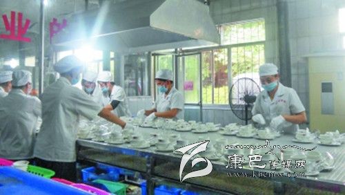 經(jīng)過消毒后,筷子會被最先單獨分出,獨立包裝,由專人負責(zé)。其余餐具被送到傳送帶上,由工人分工負責(zé)擺餐具,盤子在下,碗勺在上,按照包裝要求擺好。