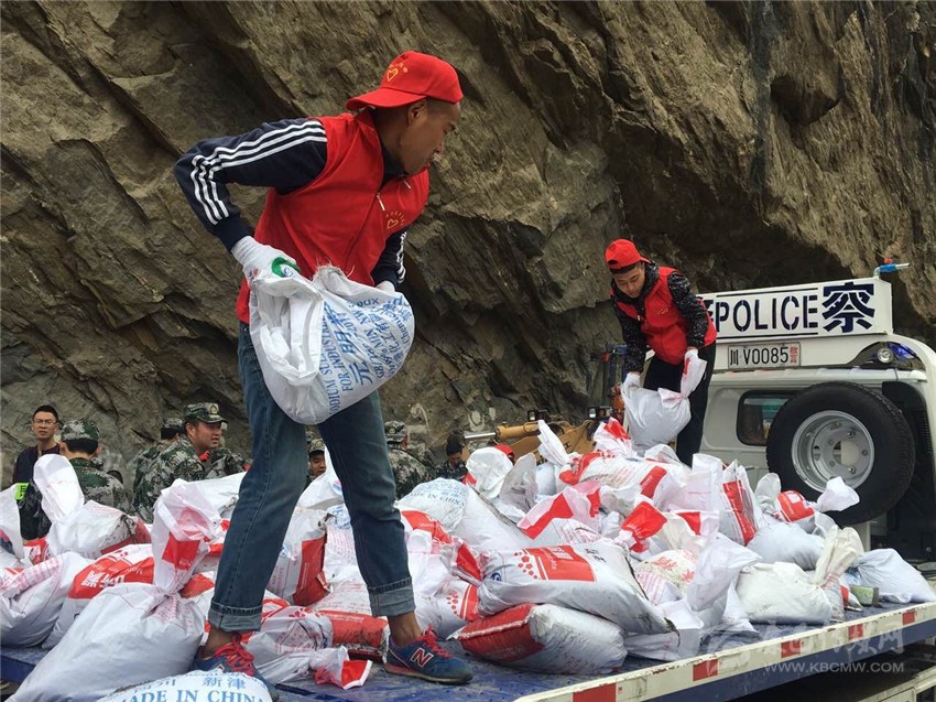 志愿者正在丹巴縣抗洪現(xiàn)場(chǎng)搬運(yùn)沙袋。