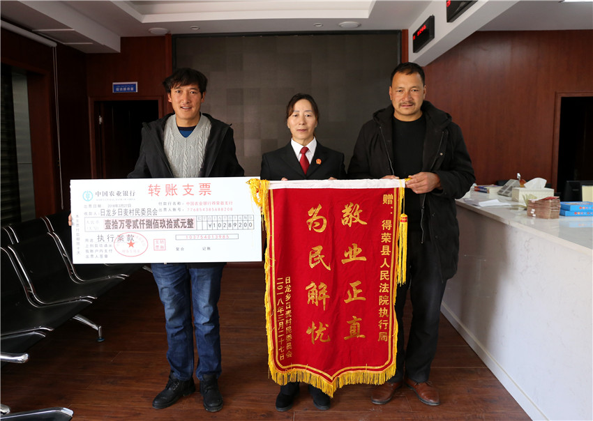 在執(zhí)行款發(fā)放現(xiàn)場,得榮法院執(zhí)行局局長小娜錯法官正逐一核對當事人信息,辦理領款手續(xù),她向筆者介紹說:“去年開始,我們在共擬定出了29個基本解決執(zhí)行難的工作任務,形成了7條具體措施,對所屬的11件執(zhí)行難案每件形成專項行動方案,并將‘一案一辦法’的基本原則落實到了后續(xù)的23件案件執(zhí)行當中,取得了良好的執(zhí)行效果,今后我們將持續(xù)深入執(zhí)行難專項行動,全面深入落實依法治理,切實保護人民群眾的合法權益,努力讓人民群眾在每一件司法案件中都感受到公平正義,感受到更多的幸福感和安全感?!?/p>